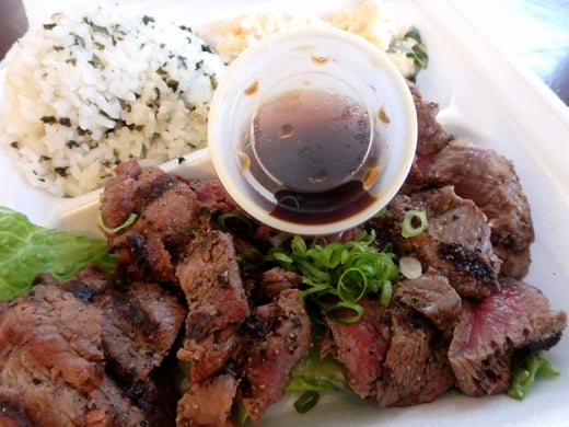 와이키키 해변에서 바로 주문 제작되는 스테이크와 치킨 플레이트를 즐겨보세요. 건물 지하에 편리하게 위치해 있습니다.